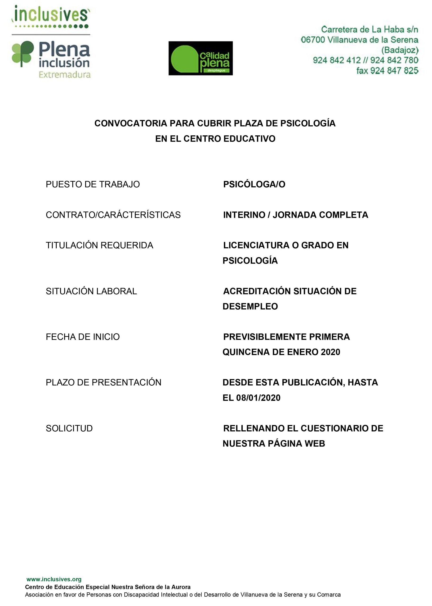 ¿Eres psicólogo/a y te gustaría trabajar con nosotros? Ofertamos una plaza de psicólogo/a para nuestro Centro de Educación Especial Ntra. Sra. de la Aurora con contrato de interino a jornada completa. Imprescindible tener el Grado o Licenciatura en Psicología y acreditar la situación de desempleo.